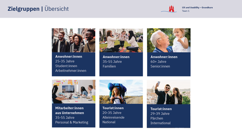 This project was carried out during a UX and Usability workshop at Cimdata Berlin in a small team. Our task was to analyse and improve the usability of Hamburg’s official city website. We worked through the full UX process, starting with user research, surveys and interviews, which helped us define key target groups and build detailed personas.